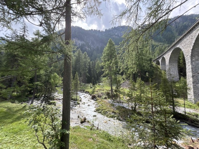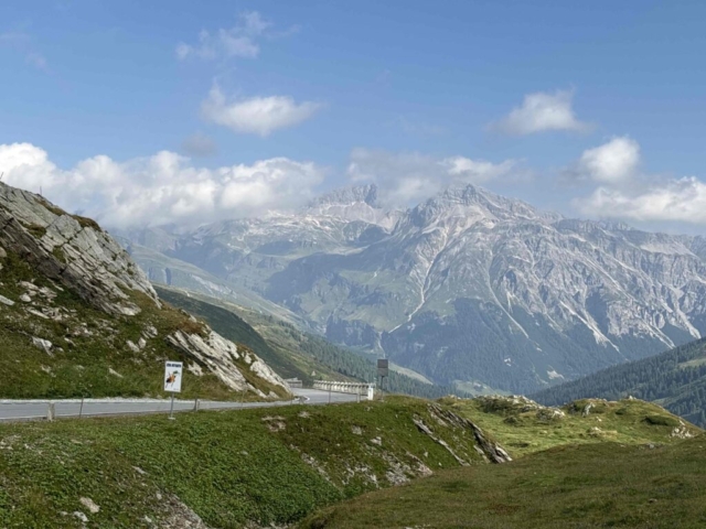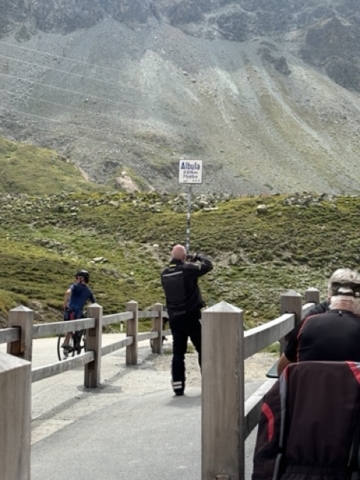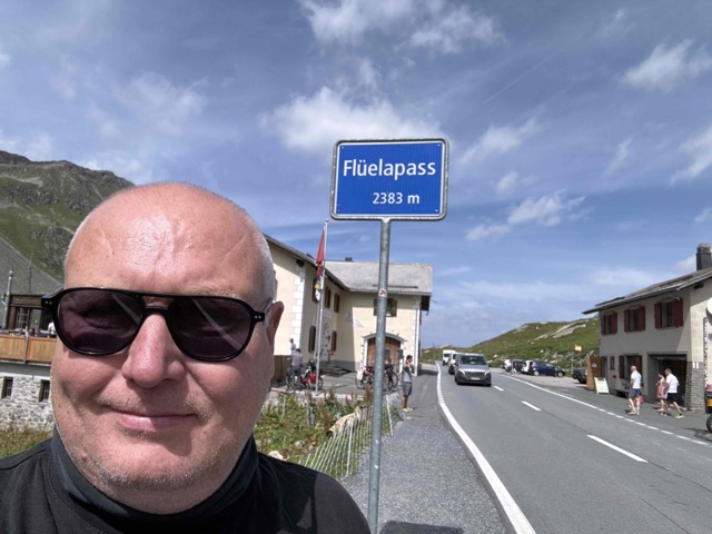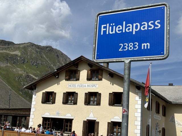 Oppassen dus op het rechter handje want de boetes zijn hier aanmerkelijk hoger. Het weer was heerlijk (tussen 19 en 29 graden heb ik voorbij zien komen) en de wegen prima. De passen lijken lager en minder uitdagend, maar dat komt vooral omdat je al start vanaf een dal dat al hooggelegen is. De Fluelapas was onze eerste pas op deze tocht. En hoewel gezellig druk op de top besloten we verder te rijden voor onze lunch.