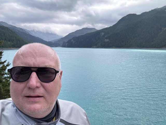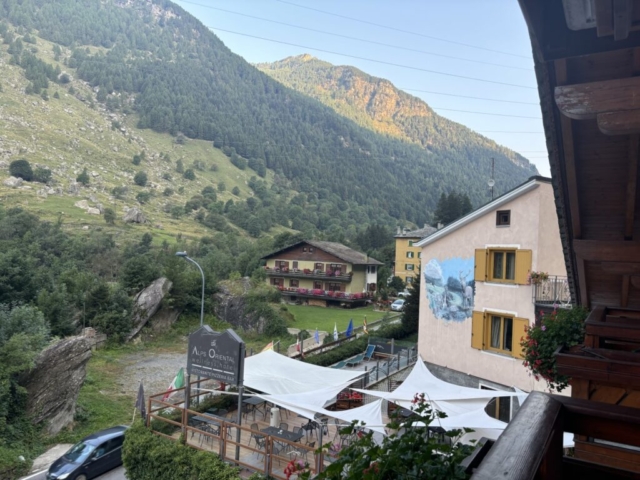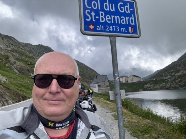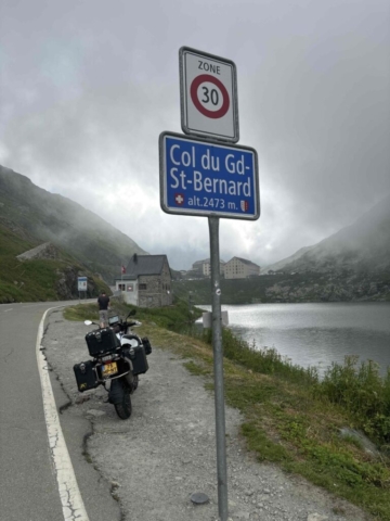 We vertrokken om half 10, voor een soort van overgangsetappe; eerst reden we terug Zwitserland binnen voor de Splügen en San Bernadino pas. Met name deze laatste, die we nog niet eerder reden, verraste ons aangenaam. Daarna reden we via de Italiaanse zijde westwaarts, om ons te positioneren voor de Grand Saint Bernard, die voor morgen op ons lijstje staat. De temperatuut steeg naar flinke hoogten (+ 30 graden) zodat we aan een bergfonteintje onze koelvesten deden dompelen in koud water. Onze rit eindigde bij Hotel Crabun in Pont Siant Martin, waar we door een alleraardigste Italiaanse werden voorzien van een koele Birra Moretti.