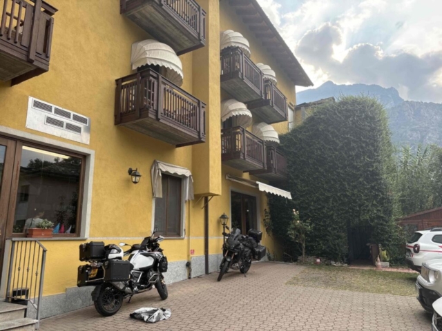 De tankbeurt was voorzien in Italië (land 4 vandaag!) en toen ook de motoren weer “gevoederd” waren draaiden we weer noordwaarts, richting de Splügenpas. Deze staat voor morgen op de planning, maar het uitgekozen hotel ligt ergens halverwege de klim. Voor zover nu te oordelen; prima hotel!