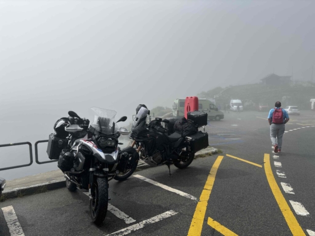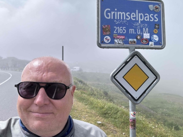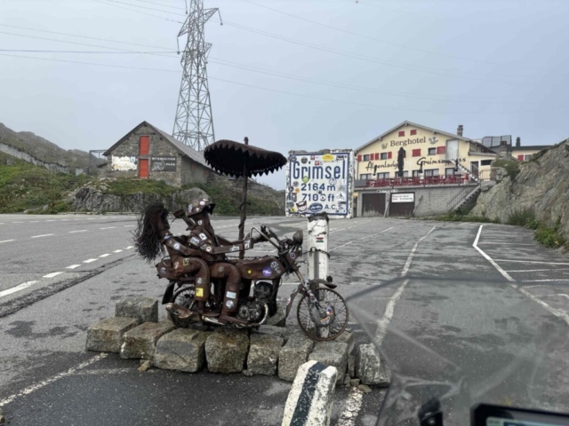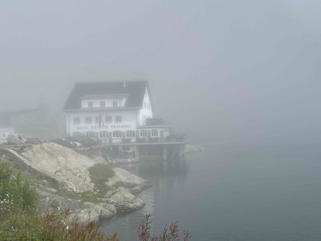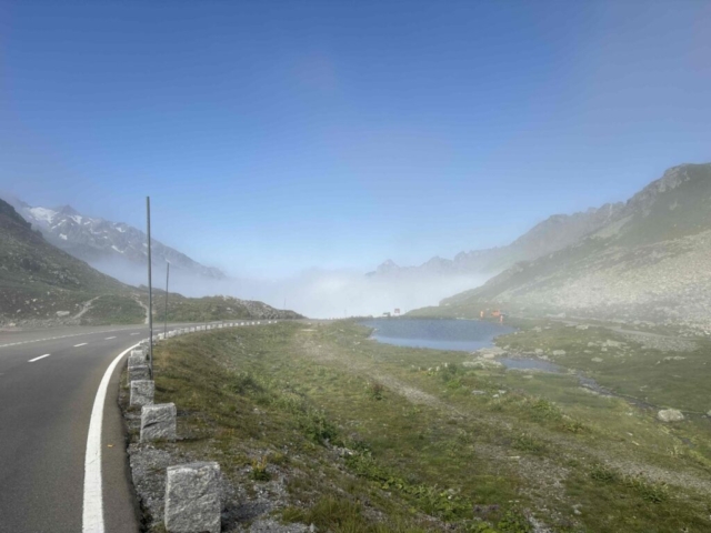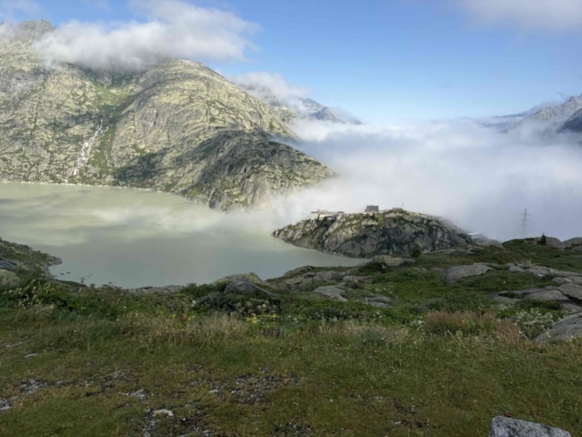 Tijdens een tankstop waarbij PSL klappertandend van kledij wisselde werd besloten het beoogde hotel in Ulrichen te bellen en te boeken. Vooraleer we daar zouden kunnen arriveren moest echter minimaal de Grimselpas gereden worden. In mist / laaghangende bewolking vervolgden we onze weg. Hielden gisteren onze koelvesten het niet bij, vandaag mocht bij 9 graden de handvatverwarming zijn werk doen! Eenmaal op de top was plots een waterig zonnetje te zien. en na 200 meter afdaling gereden te hebben was alles verdwenen en werd de lucht strakblauw.