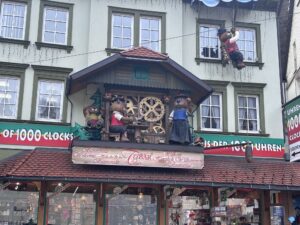 Gaandeweg stopte de miezer en toen we in Triberg stopte voor een kop koffie waren ook de wegen droog. Desondanks namen we rustig de tijd om een winkel met prullaria in de meest kitscherige vormen te bezoeken. Aangetrokken door de grote koekoeksklok die de voorgevel sierde.